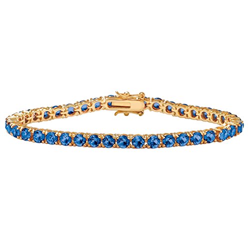 Put the right fashion spin on new season wardrobes with this round birthstone tennis bracelet, ready to boost the style quotient of everything from work to weekend wear. 7" length. 14k gold-plated. Specify 1 birthstone. Birthstones are simulated gemstones.